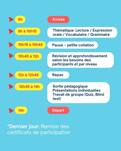 Les stages ont lieu tous les jours de 9h00 à 14h00, avec une pause mi-matinée et une pause à midi (repas non-compris).